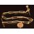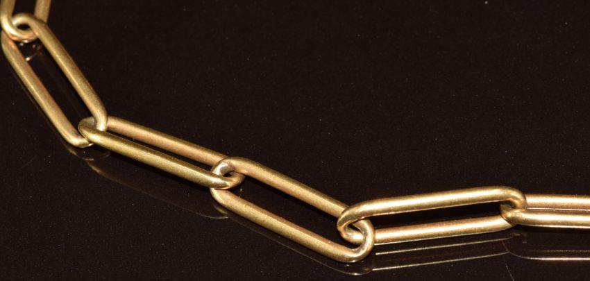 An 18ct gold Albert / watch chain made up of elongated oval links (31g, 31cm), with 1909 gold half sovereign pendant and Victorian pocket watch key set with a bloodstone intaglio depicting a man with a knife
