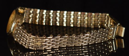 Rotary 9ct gold ladies wristwatch with gold hands and hour markers, champagne dial and quartz movement, on 9ct gold bracelet, case diameter 16mm, 15.3g, in original box with guarantee.