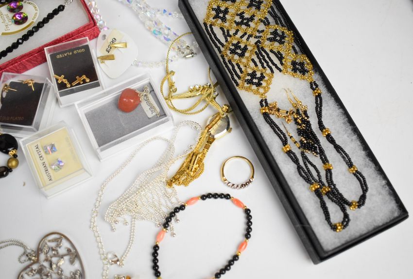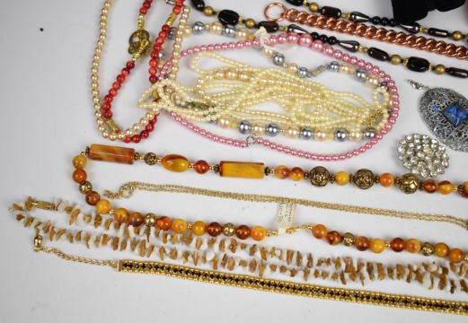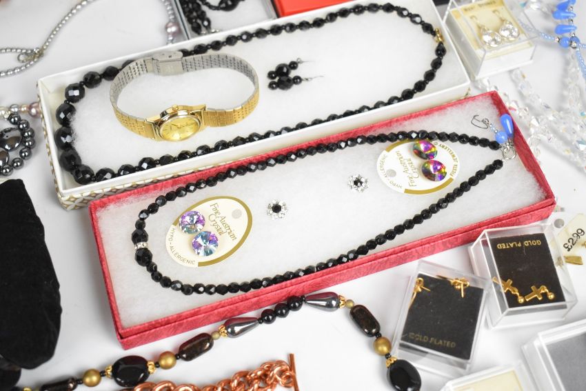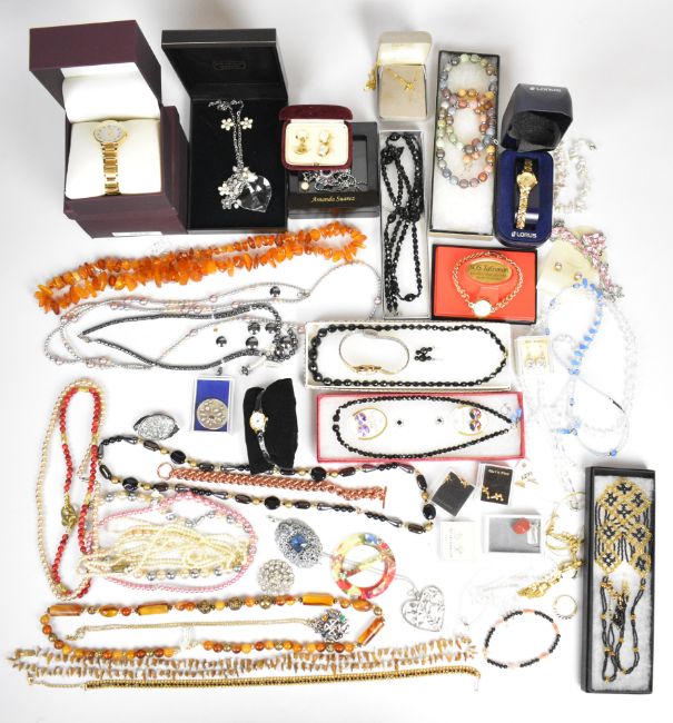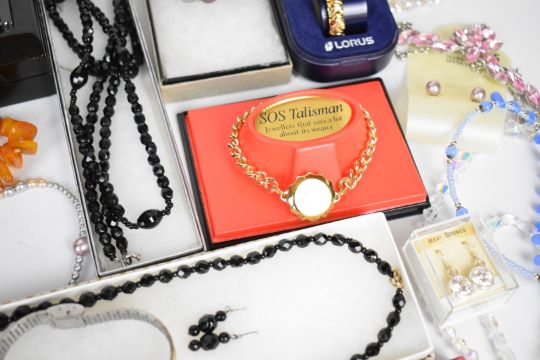 A collection of costume jewellery including beaded and crystal necklaces, Whitby jet and mother of pearl brooch, other vintage brooches including Exquisite, French jet, pearl bracelet, Accurist watch in original box, amber necklace, etc