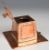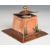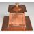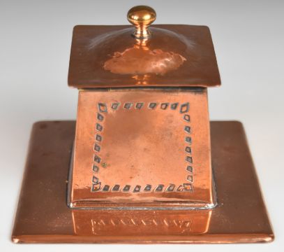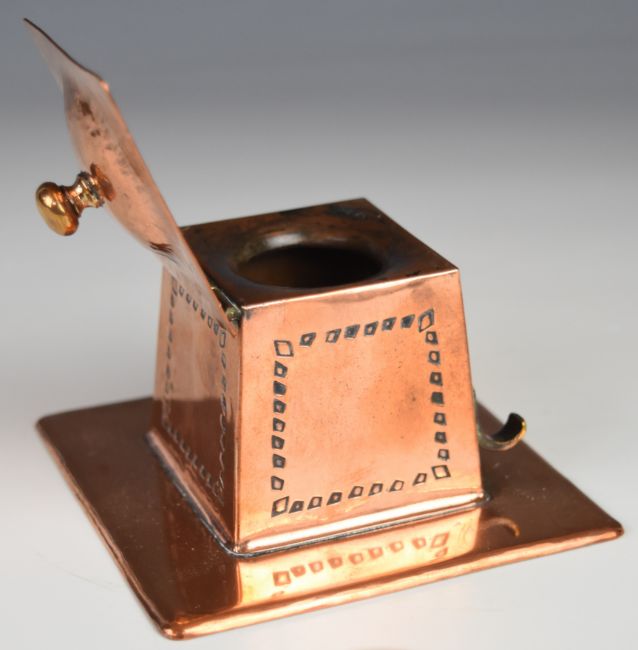 Arts & Crafts hammered canted inkwell with hinged lid, porcelain liner and pen holder, W10 x D10 x H8cm