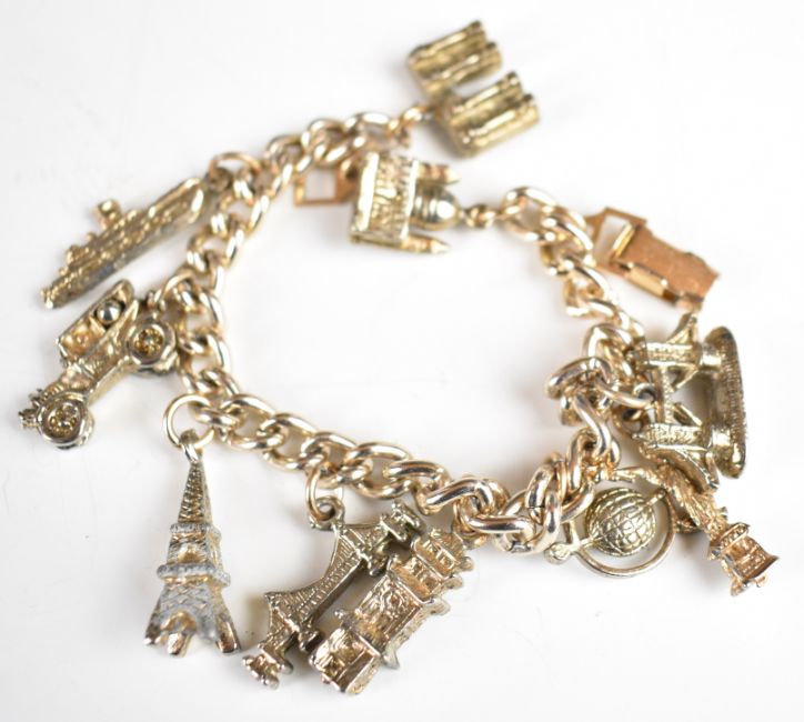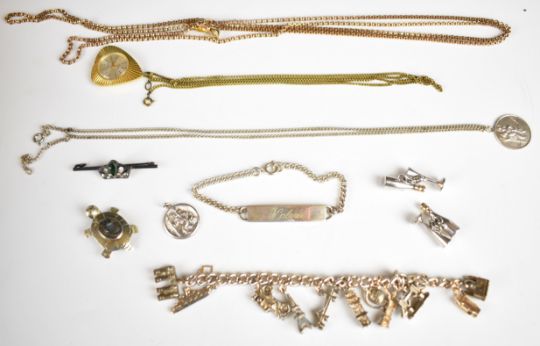 A rolled gold guard chain, silver and paste brooch, two silver St Christophers, silver bracelet, etc
