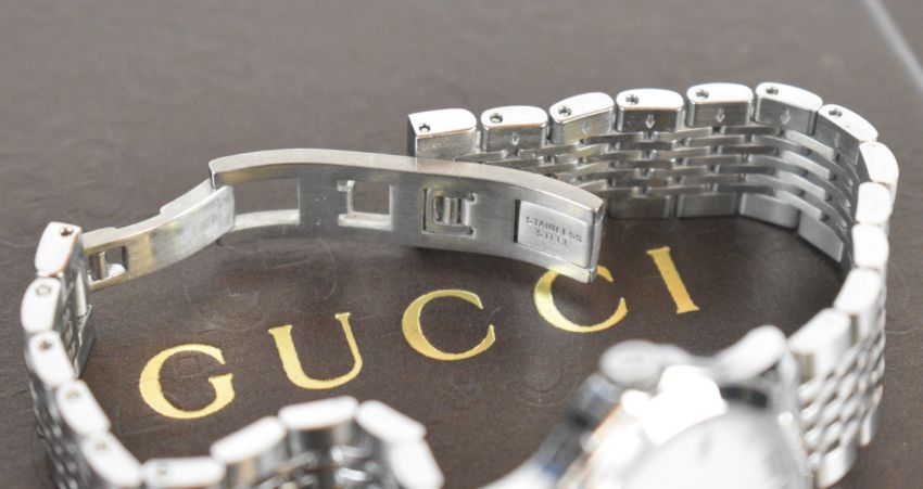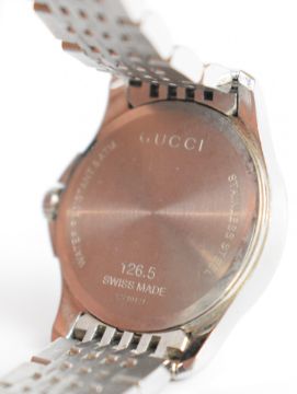 Gucci ladies wristwatch ref. 126.5 with date aperture, luminous hands, mother of pearl dial, diamond hour makers, diamond set stainless steel case and quartz movement, on stainless steel bracelet, case diameter 27mm, in original box with related paperwork.
