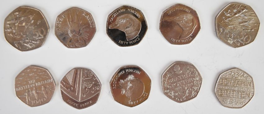 Collectable 50p coins including five Falkland Islands penguins, Beatrix Potter, Paddington Bear, Sherlock Holmes, Battle of Britain and a collection of London Mint coin / banknote packs with a total of eleven coins / notes