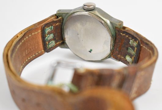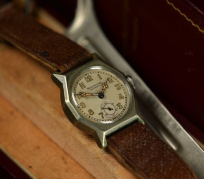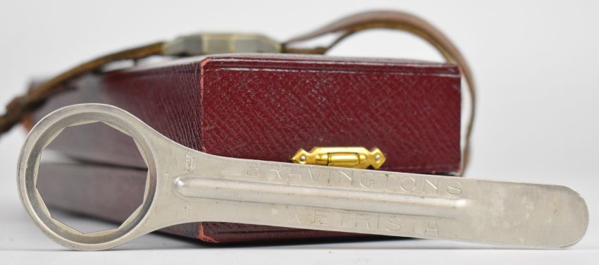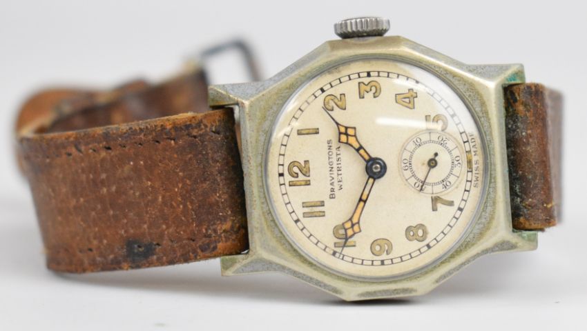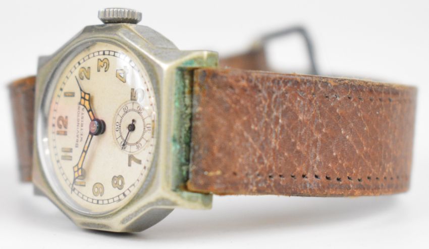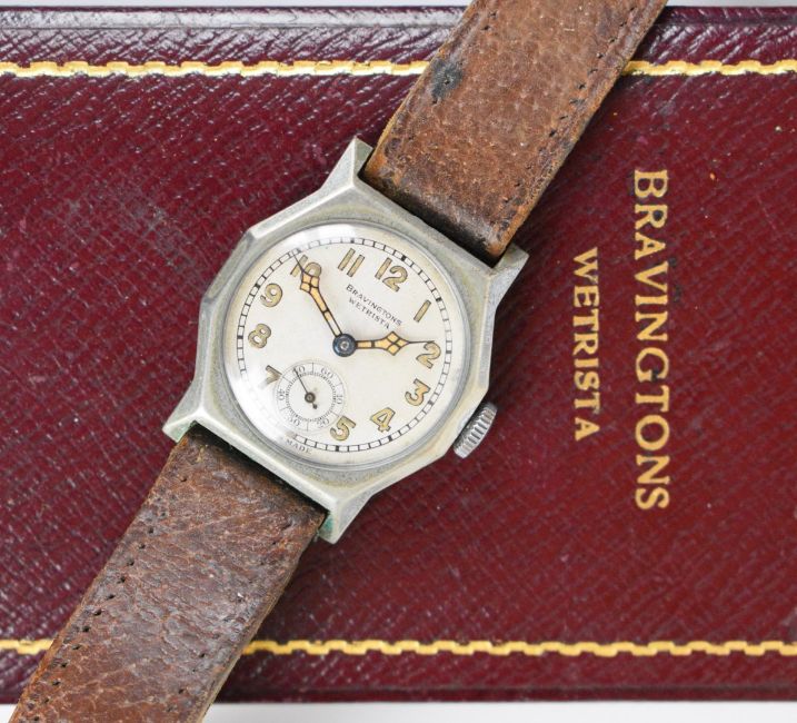 Bravingtons Wetrista gentleman's wristwatch with inset subsidiary seconds dial, luminous hands and Arabic numerals, silver dial and mechanical movement, on brown leather strap, case diameter 28mm, in original box with warranty, booklet and case opening tools.