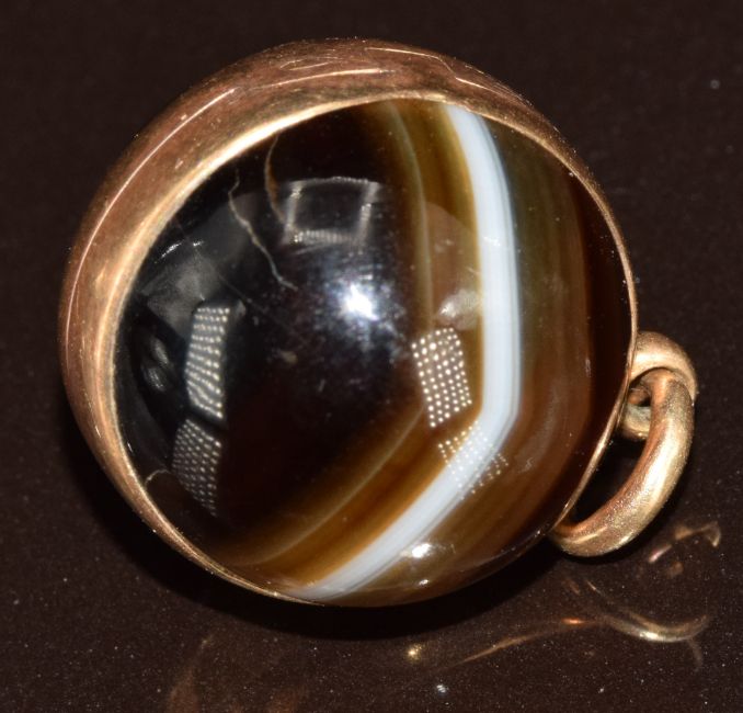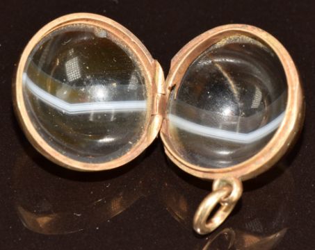 Victorian banded agate locket with 9ct gold hinge and loop, 6.1g, 18mm