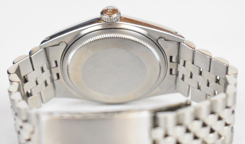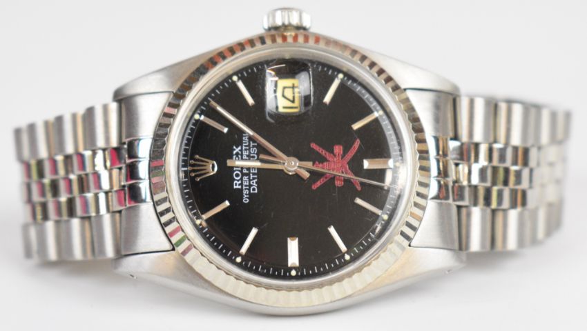 Rolex Oyster Perpetual Datejust gentleman's automatic wristwatch ref. 1601 issued by HRH Sultan Qaboos Bin Said of Oman, with royal khanjar crest to the black dial, date aperture, luminous tipped steel  hands and baton hour markers, bevelled bezel, stainless steel case and 26 jewel calibre 1570 movement, on stainless steel bracelet, case diameter 36mm, serial number 3890380.