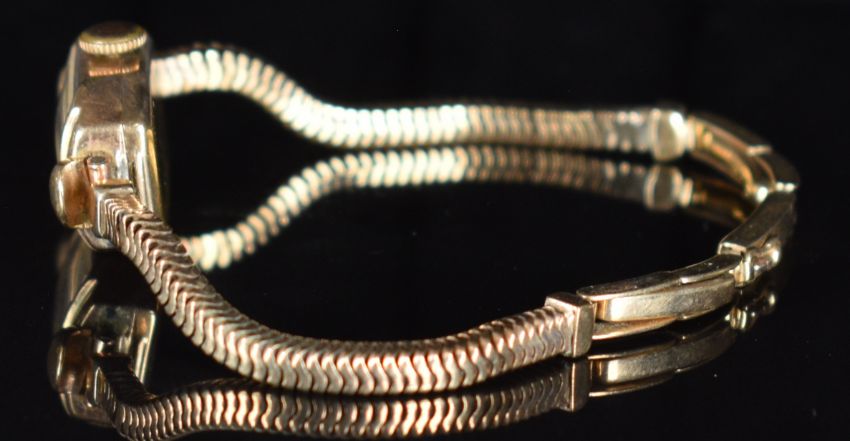 Rotary 9ct gold ladies wristwatch with Arabic numerals, silver dial and signed calibre 790 movement, on 9ct gold bracelet, case width 14mm, 15.8g