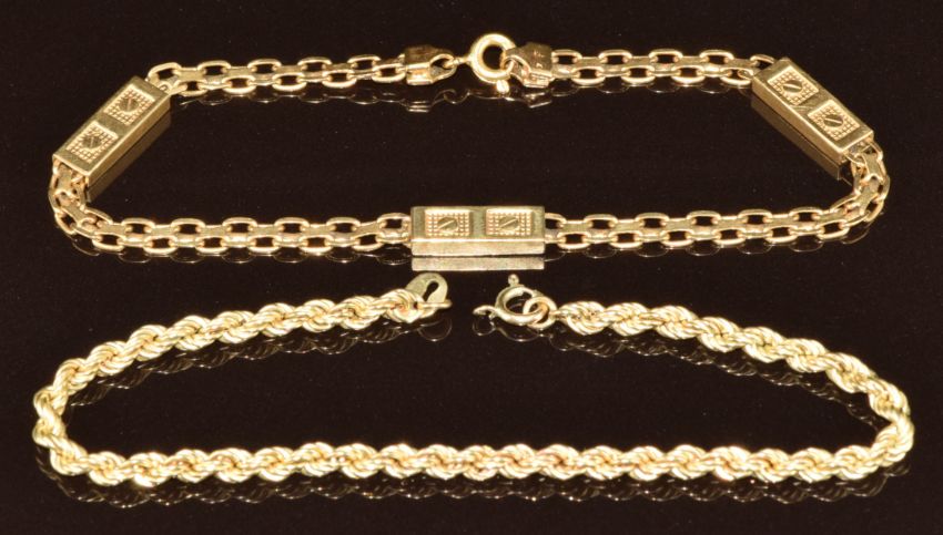 An 18ct gold bracelet (6.8g, 18.5cm) and a 9ct gold rope twist bracelet (1.6g, 17cm)