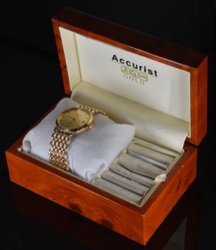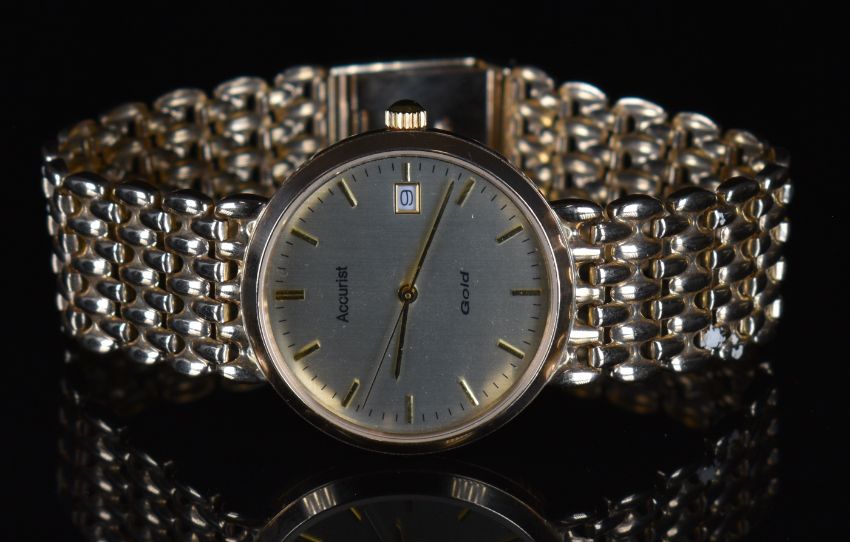 Accurist 9ct gold gentleman's wristwatch with date aperture, gold hands and hour markers, champagne dial and quartz movement, on 9ct gold bracelet, case diameter 32mm, 38g, in original box.