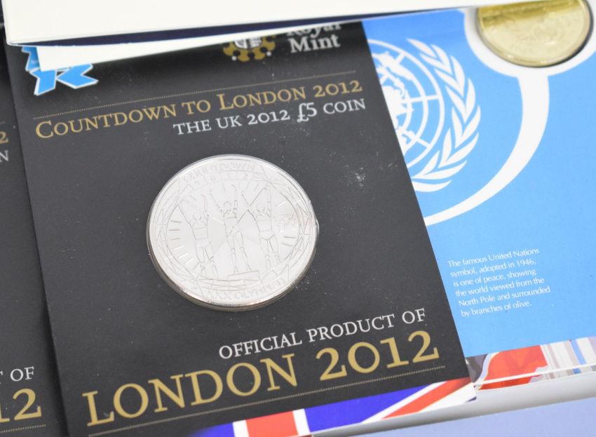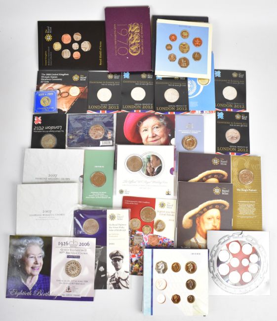 Royal Mint coins and coin sets comprising 1970, 1994, 1995, 2006, 2007, 2008 and 2012 coin sets, 2002 Queen Elizabeth the Queen Mother, 2006 80th Birthday, 2007 Diamond Wedding,  2 x 2009 Henry VIII, 2011 Duke of Edinburgh, 2011 Royal Wedding, 2012 Diamond Jubilee and six London Olympics interest £5 coins, 1989, 1995 and 2008 Olympic handover £2 coins, all in original packaging