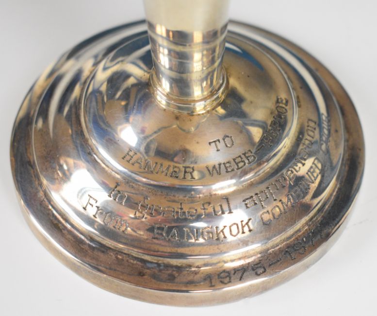 Cased silver candelabra, likely Indian or similar, cased silver model of a junk or similar boat marked silver 925 and a presentation model of a lock gate with hallmarked silver plaque to base, weight of junk 43g