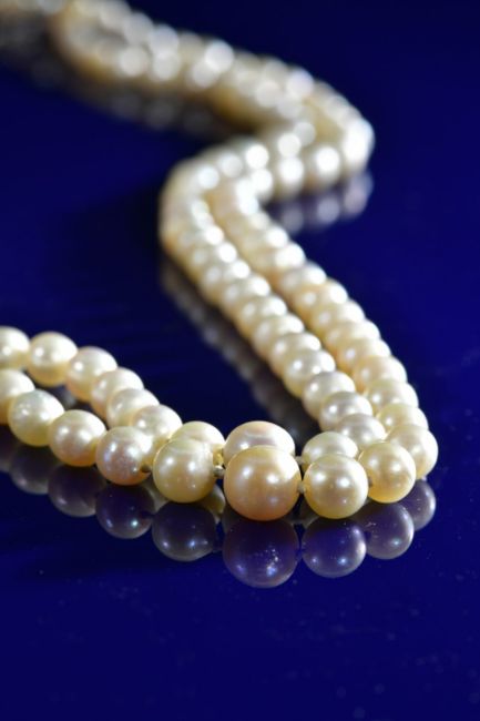 A double strand of natural saltwater pearls made up of seventy five and seventy six near round semi-baroque pearls graduating from 7.6mm to 2mm, the white gold clasp set with rose cut diamonds, eight pearls are beaded cultured. With valuation from Mappin & Webb dated 2002 and AnchorCert pearl report, 42.5 & 44.5cm