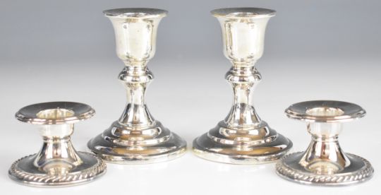 Two pairs of silver candlesticks, one pair marked Thailand sterling, the other pair marked 925, height of taller 10cm