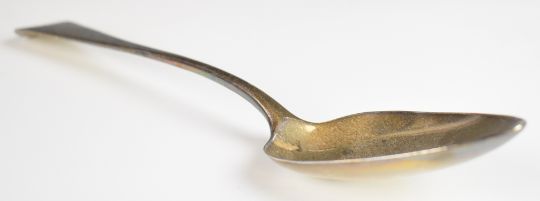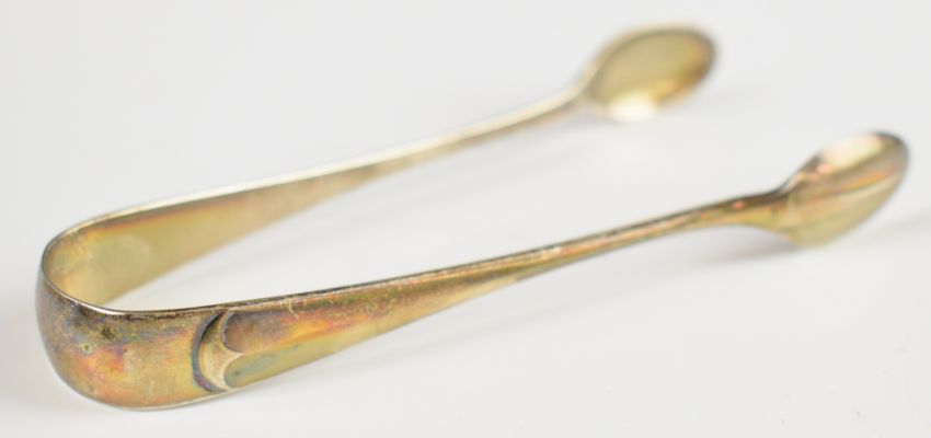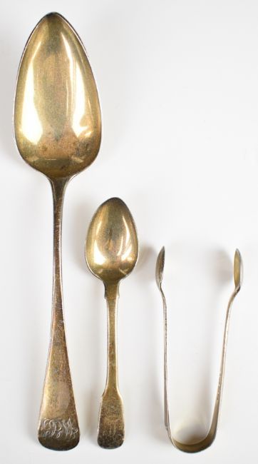 Georgian hallmarked silver table spoon, Georgian fiddle pattern teaspoon and a pair of hallmarked silver sugar tongs, length of longest 23cm, weight of all three 117g