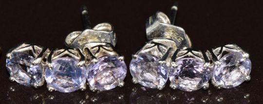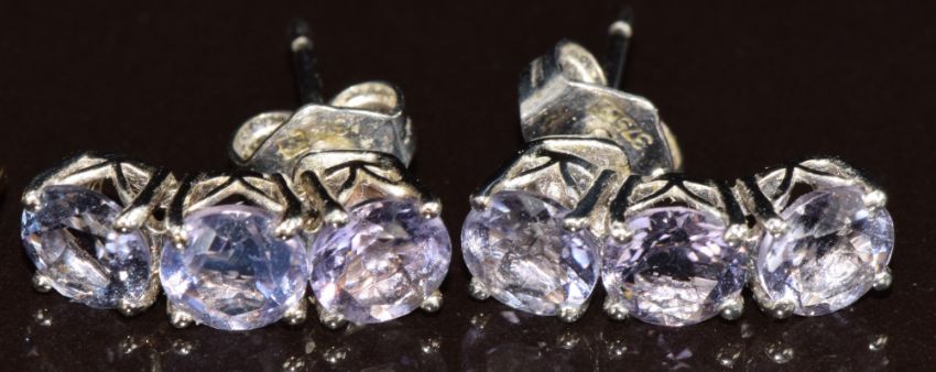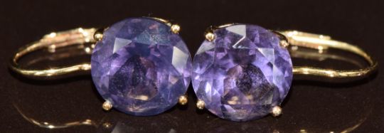An 18ct gold bracelet with spherical beads (2.5g, 19cm) and two pairs of 9k gold earrings both set with amethyst (5.3g)