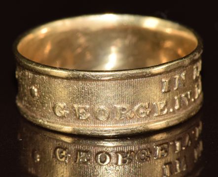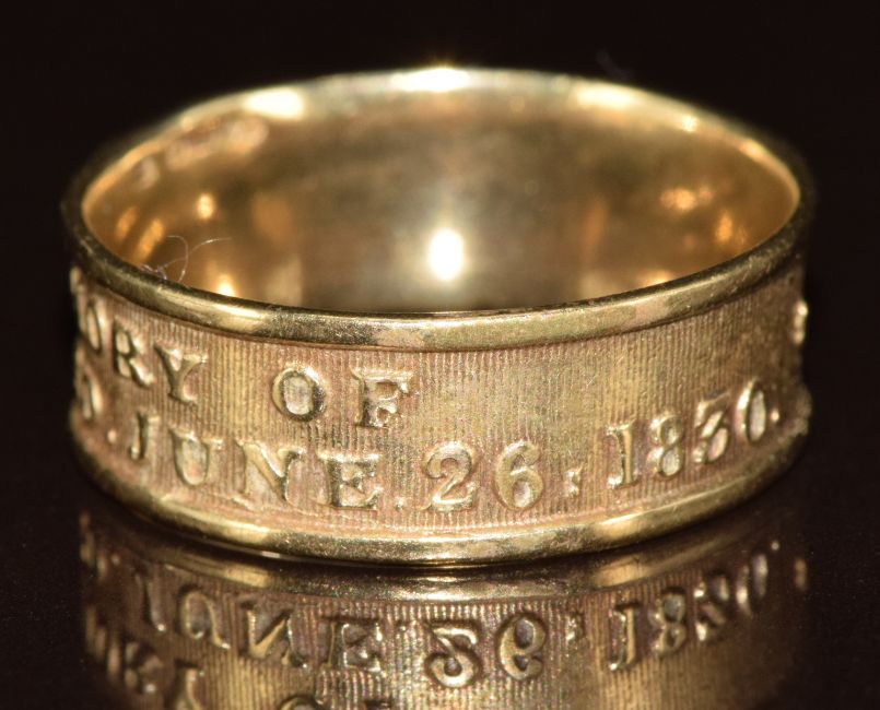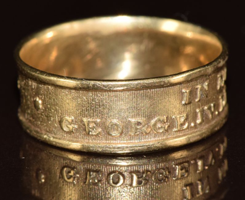 A 9ct gold mourning ring embossed 'In Memory of George IV died June 26th 1830', 3.3g, size R