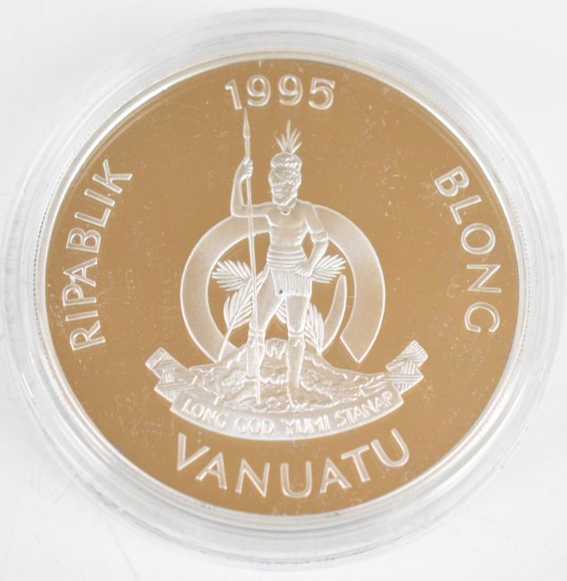 Two Royal Mint 155g fine silver proof Queen Elizabeth the Queen Mother coins comprising 1995 Vanuatu 100 Vatu and 1996 Tuvalu $20, both in boxes with certificates