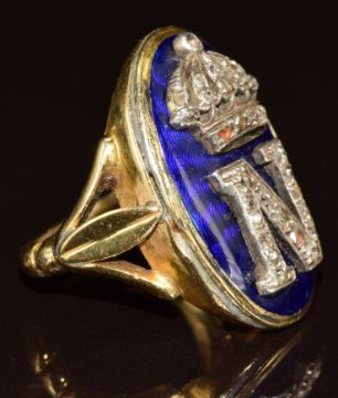 Victorian 18ct gold court ring set with blue enamel with a mounted crown and letter 'N' encrusted with 30 rose cut diamonds engraved to inner band 'Napoleon III, 2nd Dec 1866', 8.6g, size F. Valuation schedule dated 2005 states that the text to the inner band (not currently legible) reads 'Napoleon III to P O Callaghan Esq., LLD, DCL, FSA &c, 2 December 1866'