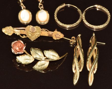 Three pairs of 9ct gold earrings, two 9ct gold brooches (6.5g) and a 9ct gold cased watch