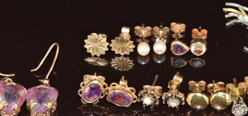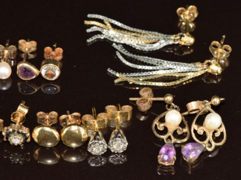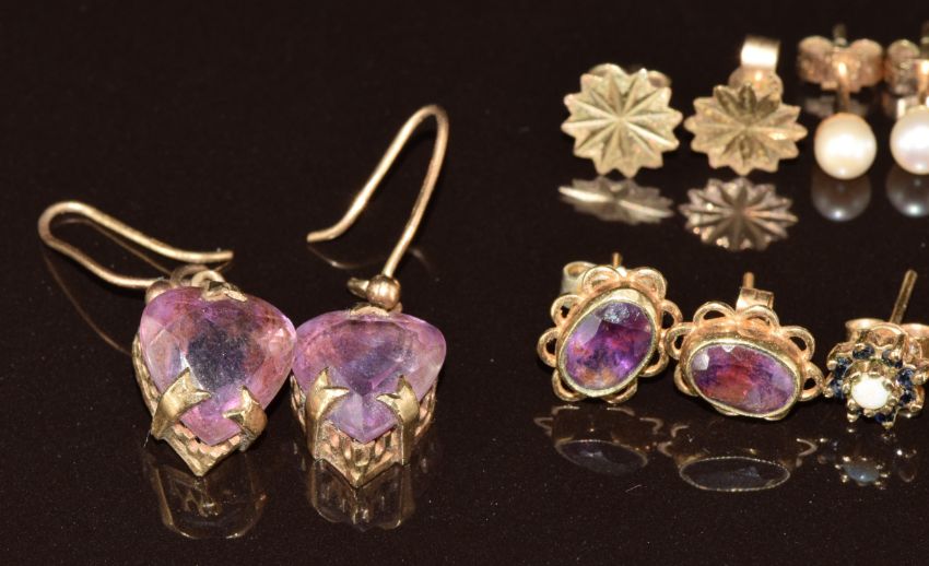 Nine pairs of 9ct gold earrings including c1900 pair set with a heart cut amethyst, diamond studs, opal and sapphire, pearls, etc, 12.9g