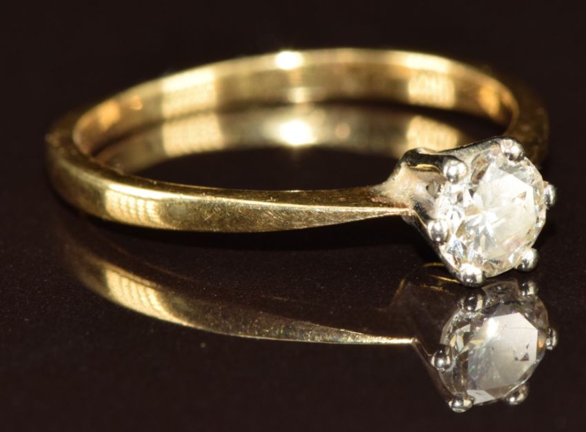 An 18ct gold ring set with a round cut diamond of approximately 0.5ct, 2.7g, size R