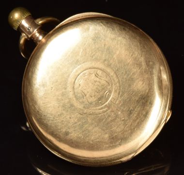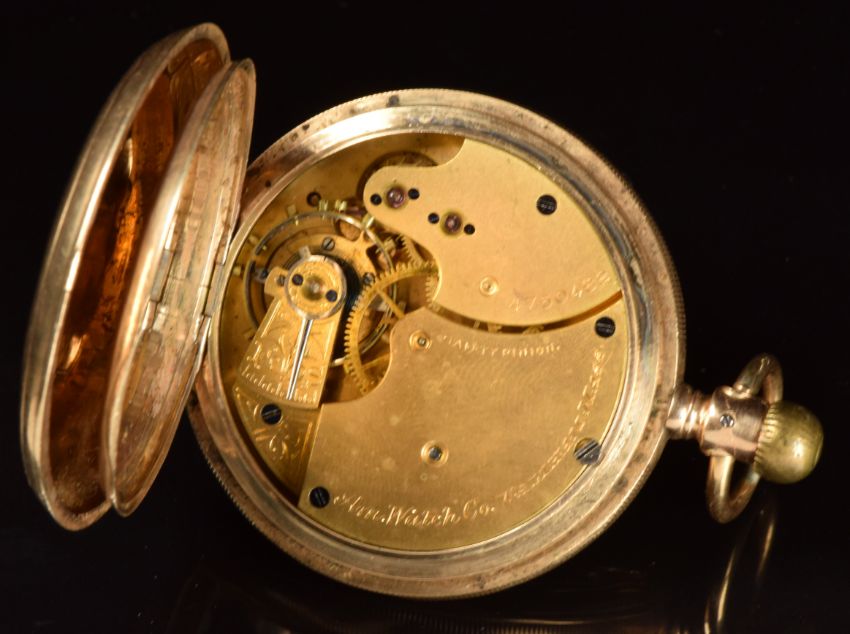 Waltham 10ct gold keyless winding half hunter pocket watch with subsidiary seconds dial, blued hands, black Roman numerals, white enamel dial, inlaid blue enamel Roman numerals to the case and signed movement, case diameter 48mm, serial number 4750482, 100.7g.