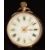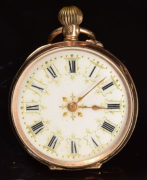Unnamed 9ct gold keyless winding open faced pocket watch with gold hands, black Roman numerals, gilt decorated white enamel dial and unsigned movement, case diameter 29mm, serial number 104026, 21.2g.