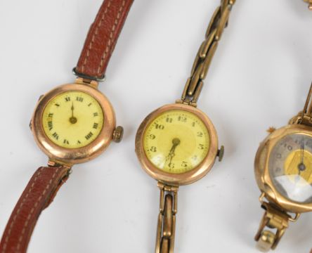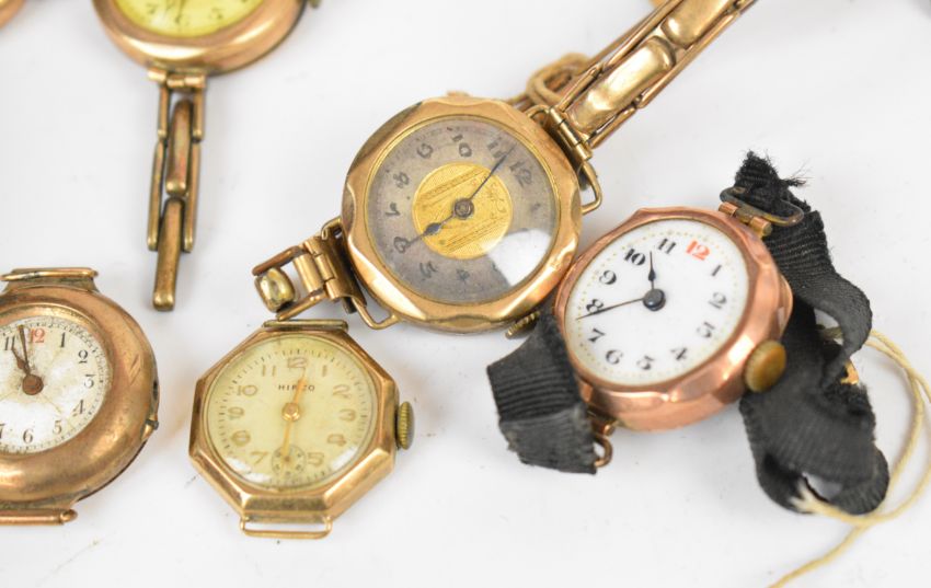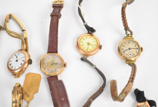 Seventeen 9ct gold ladies wristwatches including Buren, Hirco etc, mostly on leather or material straps or gold plated bracelets.
