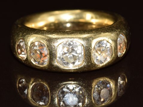 A 14ct gold ring set with five old cut diamonds of approximately 0.8ct, 0.4ct, 0.5ct, 0.3ct and 0.3ct, 26.1g, size R