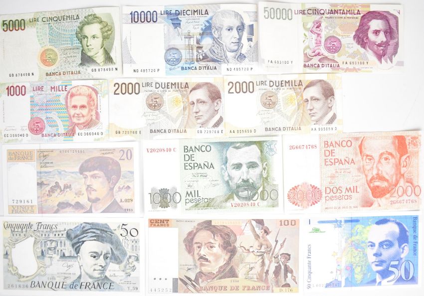 Twelve France, Italy and Spain banknotes consisting of four high-grade 1990-93 France notes (all free of pinholes and exhibiting only minor handling defects), six Italy notes including a high-grade 1992 50,000 Lire, and Spain 1000 and 2000 Pesetas notes dated 1979 and 1980
