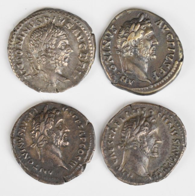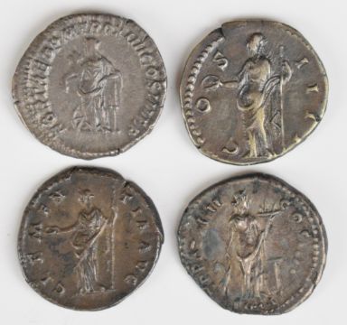 Four Roman silver Denarius of Antonius Pius, all 138-161 AD and laureate head right, comprising rev Clementia standing left holding paterae; 2 x rev woman facing right holding cornucopia and rev standing figure facing left