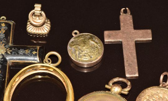 A 9ct rose gold cross (4.7g), Victorian yellow metal locket, engine turned locket, 15ct gold shoe charm (1.6g, damaged), pendant mount, yellow metal pendant set with military button, inlaid tortoiseshell cross, 9ct heart shaped clip (0.8g), etc