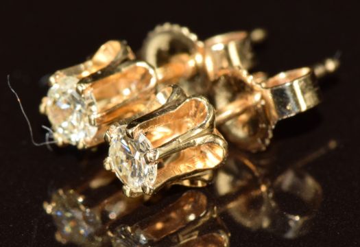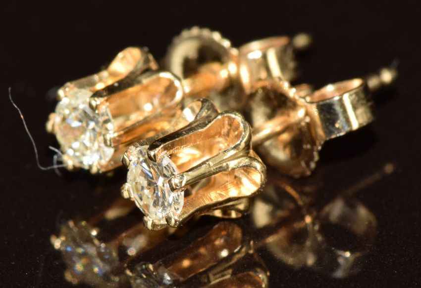 A pair of 14k gold earrings each set with a round cut diamond of approximately 0.14ct, 0.8g