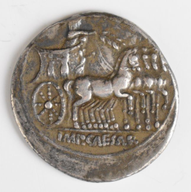 Roman silver Denarius of Octavian 30 BC, Victory facing right standing on a prow, rev Octavian driving triumphal quadriga