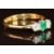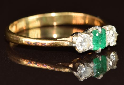An 18ct gold ring set with an emerald cut emerald of approximately 0.2ct and two round cut diamonds each approximately 0.15ct, 2.5g, size P
