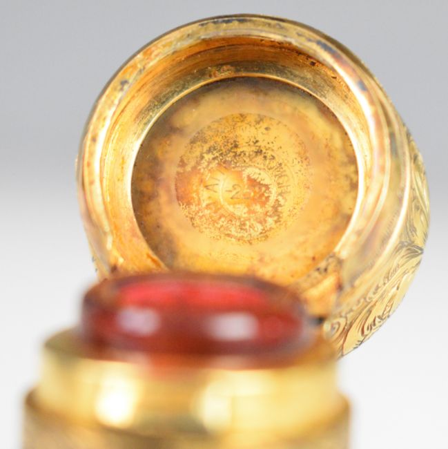 George Attenborough 252 Regent Street London cased silver gilt and cranberry glass scent bottle, the lid having engraved decoration and turquoise cabochons, named behind the ground glass panel within the lid and also within the lid of the shaped box, height of bottle 7cm