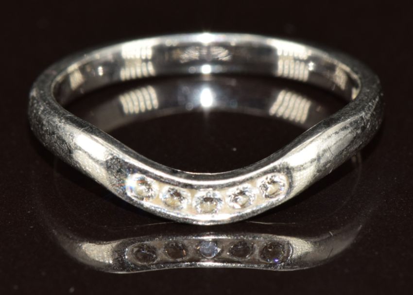 A platinum ring set with five diamonds, designed to fit around an engagement ring, 3.6g, size M