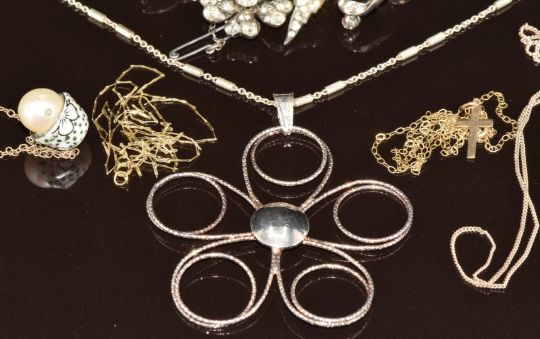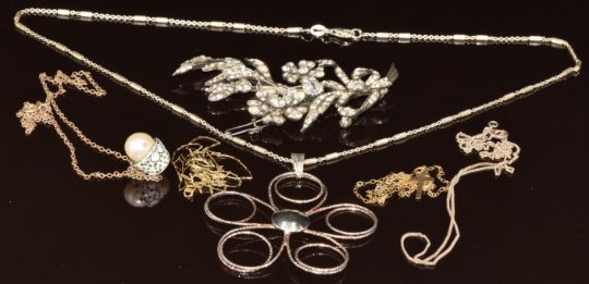 A silver brooch set with paste, two silver necklaces and two 9ct gold chains and cross pendant (0.8g)