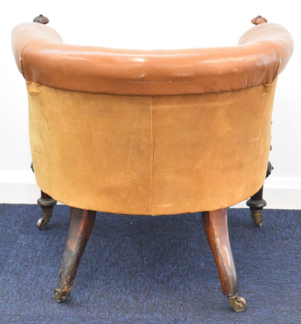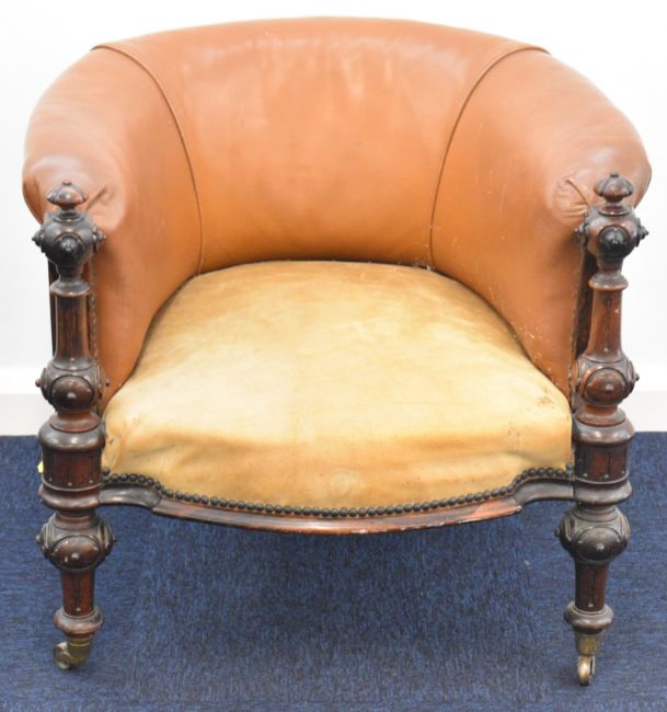Victorian upholstered rosewood tub chair with turned and carved columns to the front legs and arms, raised on castors. Overall size of chair W 66 x D 72 x H 64 cm, height of seat 35cm