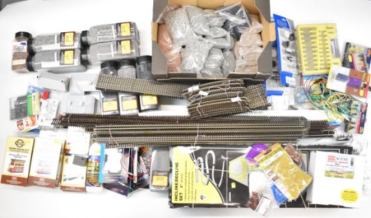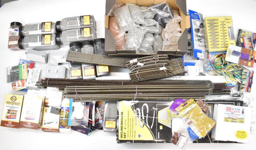 A collection of model railway track, ballast, scatter, tools and accessories, many items in original sealed packaging.