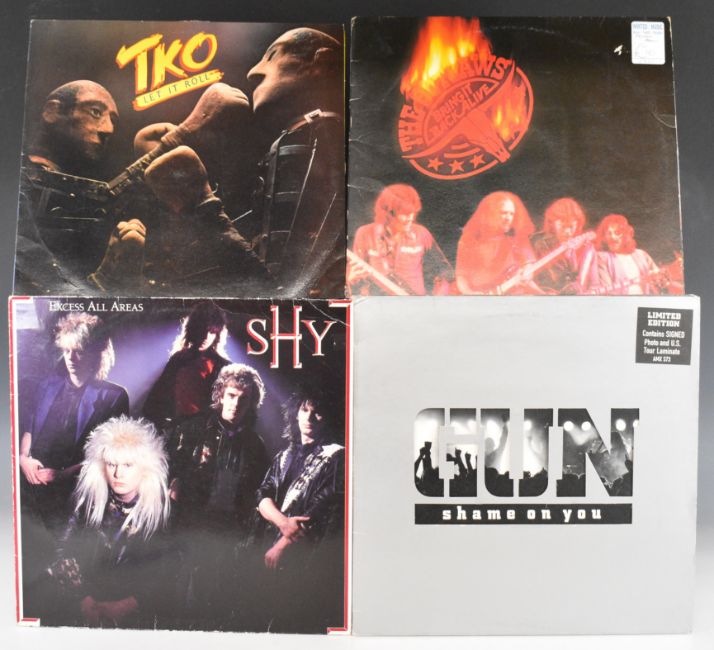 Twenty one Heavy Rock / Blues Rock / Prog Rock / Rock / Classic Rock LPs comprising a mix of USA imports and UK releases including Shy Excess All Areas, The Outlaws Bring it Back Alive, TKO Let It Roll, Recorder Three, New England self titled, Valhalla Pacifists Prumyslova Smrt, Jefferson Starship Dragon Fly, Jim Steinman Bad For Good, Utopia Adventures In Utopia, The Fixx React, Steve Gibbons Caught In The Act, Stories About Us, Pat Travers, three Status Quo, three Rick Wakeman, Robert Cray (promo only release) and Rock Machine I Love You, together with six Gun 12" singles including two copies of Shame On You in die cut limited edition sleeves, Shame On You standard 12", Better Days and picture discs for Inside Out and Money (Everybody Loves Her). Condition appears VG+ to Ex+ in the main