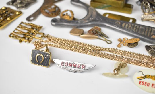 Pair of A. Barrett & Sons cut-throat razors in felt-lined polished case, pair of lighters, military figure, small circular compact with decorated lid, cannon keyrings, cufflinks, thimbles, Prefect badge, owl pin badges, National Savings enamel badge, cross pendants, miniature Whitbread tankard, gun shaped tie-pin, gilt blocked pendants, enamel badge for Coles Cranes etc