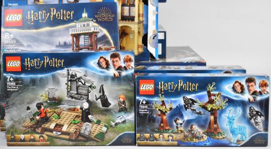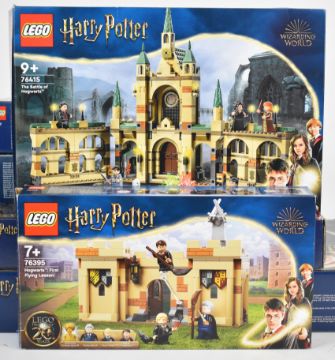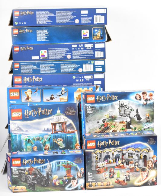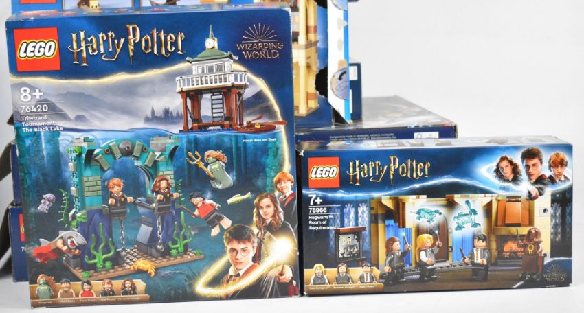 Sixteen Lego Harry Potter sets to include 12 Grimmauld Place 76408, Expecto Patronum 75945, Hogwarts Room of Requirement 76413, The Rise of Voldemort 75965, Triwizard Tournament: The Black Lake 76420, The Battle of Hogwarts 79415, Quidditch Match 75956 and Fluffy Encounter 76387, boxes have been opened, many bags remain sealed, contents have not been checked for completeness.