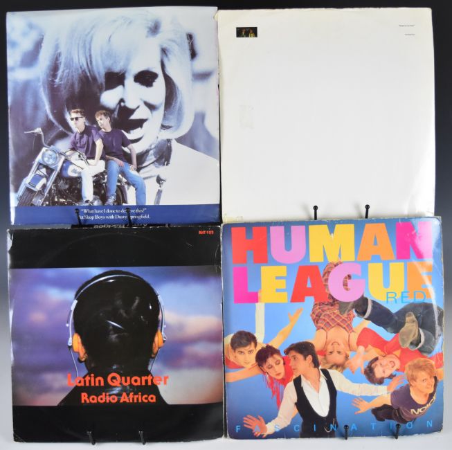 Approximately one hundred and ten 12" singles, most appear to be 1980s / 1990s Post Punk / Indie / Synth Pop / New Wave includes Blancmange, Associates, Then Jerico, Thompson Twins, New Order, Curiosity Killed the Cat, Tears for Fears, Human League, Pet Shop Boys, OMD, Frankie Goes To Hollywood, Yazoo, Cutting Crew, Wax, London Beat, Scritti Politti, EMF, Spandau Ballet, Duran Duran, Redbox, Kraftwerk, Gun, Jets, Blondie, Sting and Culture Club. Vinyl appears VG+ in the main, some may grade higher or lower