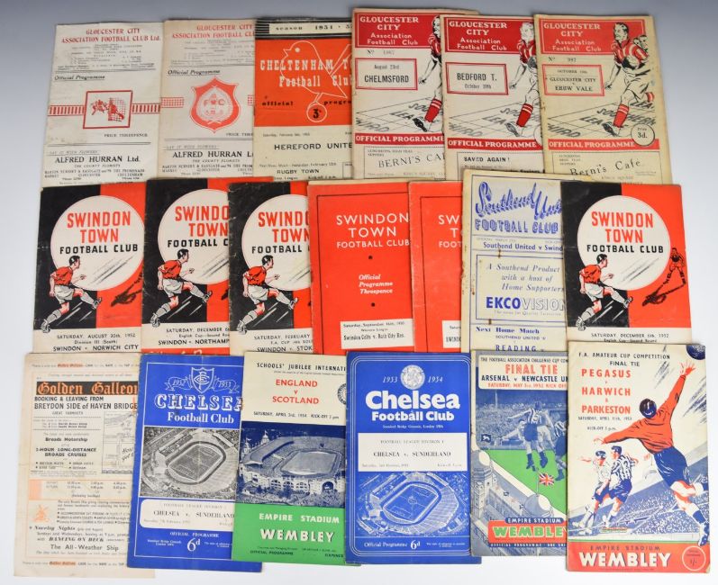 Ninety football programmes dating from the 1940's onwards including Gloucester City, Swindon Town, Bristol City, Bristol Rovers, Albert v Stirland, North v South International Trail, Wolverhampton Wanderers, Southampton, Chelsea, Arsenal, Newcastle United, West Bromwich Albion, The Jimmy Buist Benefit Match, Southend United, Wiltshire XI v Pegasus, Oxford City, Blackpool Tottenham, Chesterfield, Gillingham, Cardiff City, Newport County, Harwich & Parkeston, Aston Villa, Watford, Queens Park Rangers, Coventry etc, some cup finals and international matches.