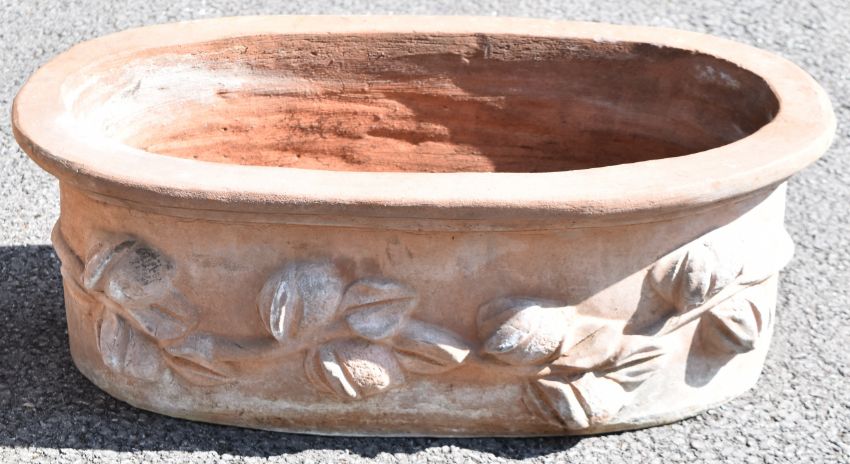 Large circular pedestal terracotta planter / jardinière (diameter 62, height 27cm) and an oval example with relief moulded decoration, W61 x D31 x H24cm