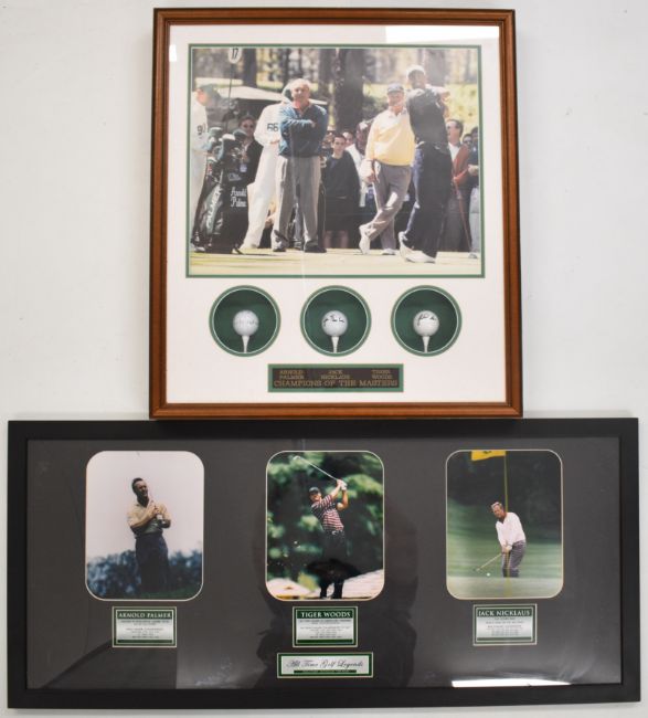 Trio of golf balls signed by Tiger Woods, Jack Nicklaus and Arnold Palmer 'Champions of the Masters' set within a box frame with mounted colour print , 62 x 54cm and framed display with images of the three golfers titled 'All Time Golf Legends', 41 x 97cm (2)