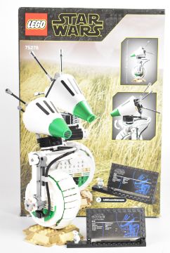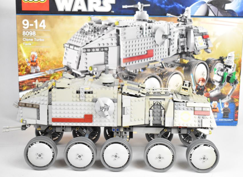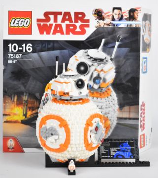 Four Lego Star Wars sets comprising AT-AT Walker 8129, Clone Turbo Tank 8098, BB-8 75187 and D-O 75278, all assembled with original boxes.