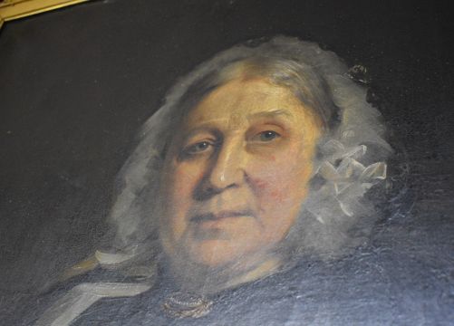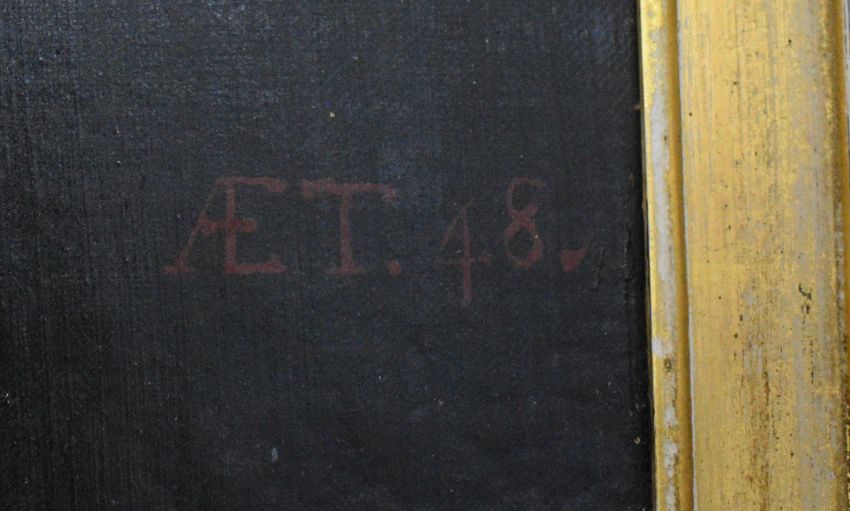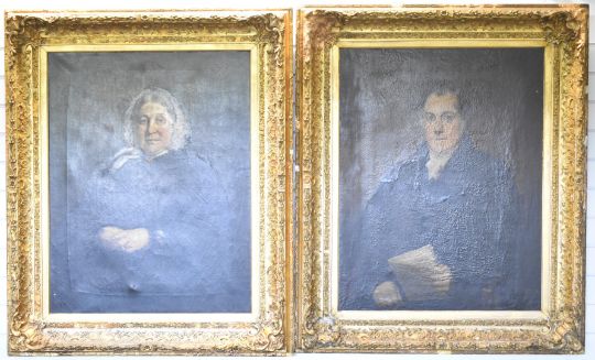19th Scottish interest pair of oil on canvas portraits of a lady and gentleman, the gentleman holding a paper titled Montrose Review and with AET 48 lower right, the lady dated 1865 lower left and with AET 72 lower right, both 90 x 70cm, in ornate period gilt frames.