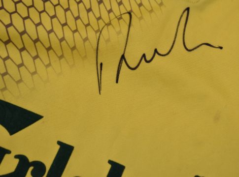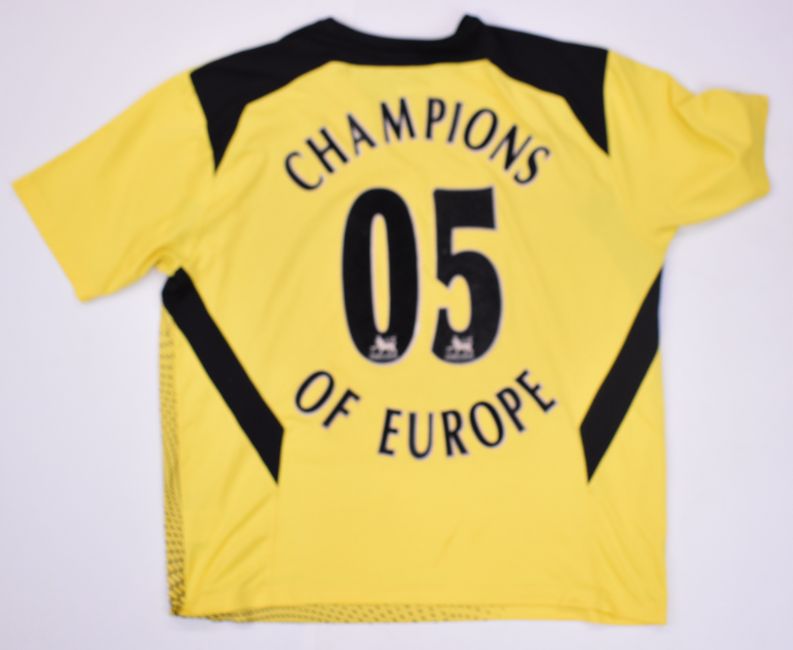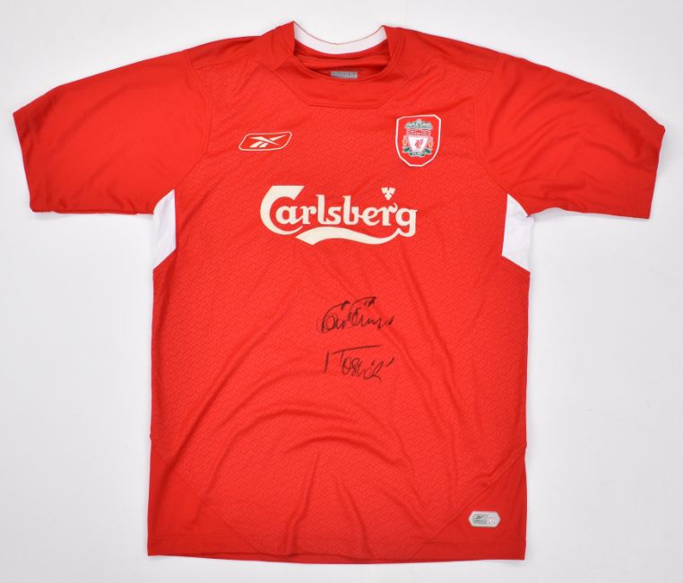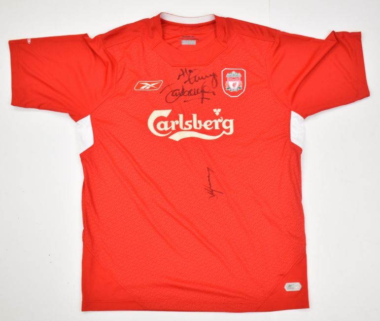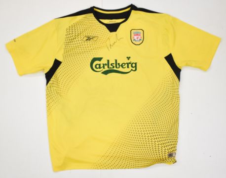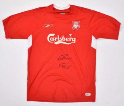 Liverpool F.C. signed replica away shirt 2004 with number 9 Djibril Cisse autograph, together with three other signed replica shirts including a Champions Of Europe 05 and another unsigned (5)
